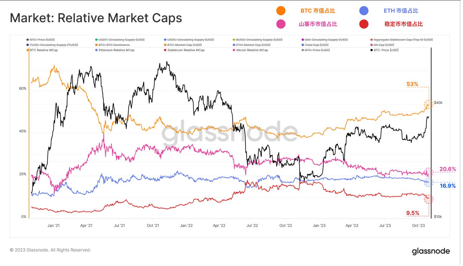 然而,重要的是要记住,比特币的主导地位正在持续上升。从相对的角度看,BTC 现在掌握了超过 53% 的数字资产市场估值,而以太坊、大型山寨币和稳定币在 2023 年都经历了其主导地位的相对下滑。比特币的主导地位已从 2022 年底创下的 38% 的周期性低点上升。