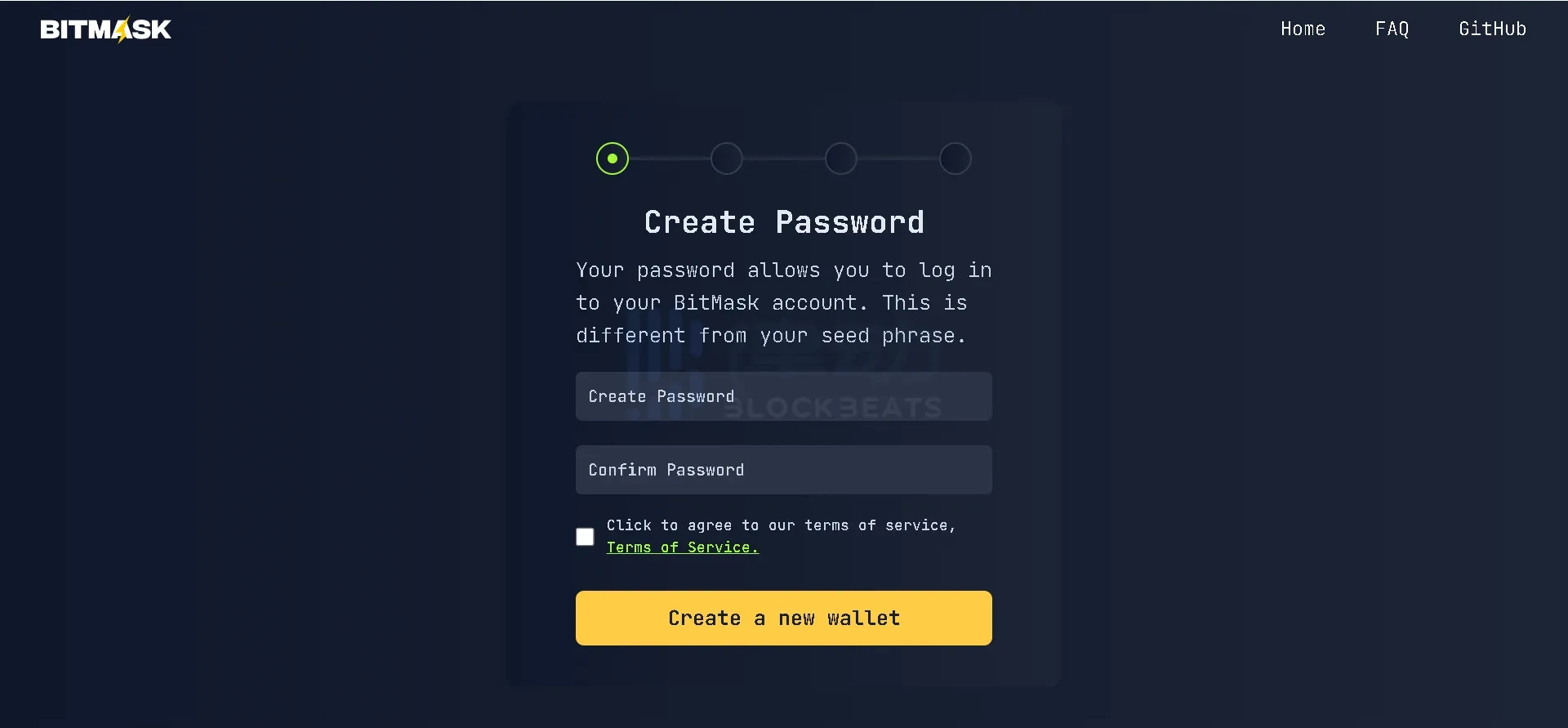 4. 根据提示创建一个登录密码(不少于 8 位字符),并勾选「同意服务条款」框,之后点击「Create a new wallet」(创建一个新钱包)。
