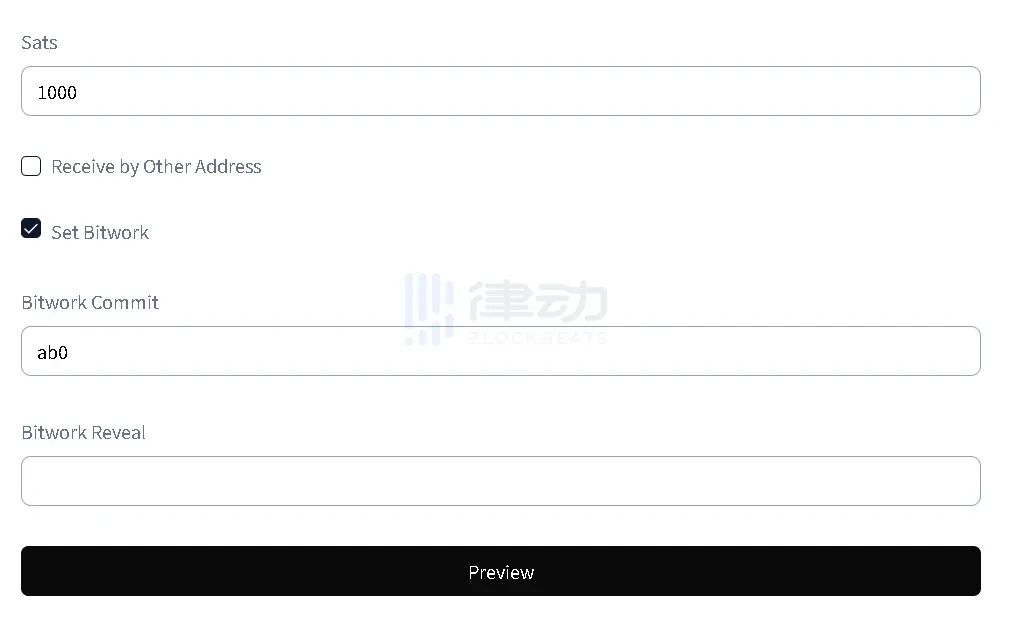 Bitwork,Bitwork Commit 里的编号要与所选编号一致,填入 ab 0 点击「Preview」启动 POW 挖矿。