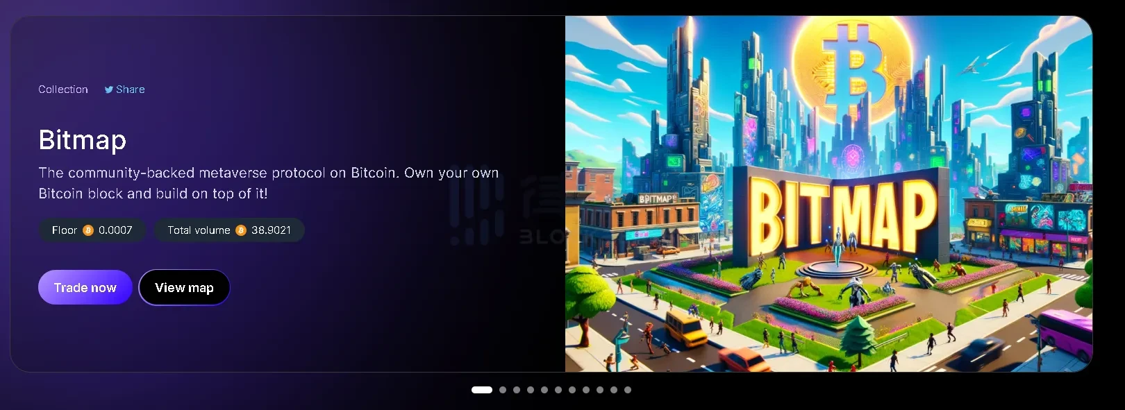 Bitmap 是比特币社区支持的元宇宙协议,每块土地代表一个 BTC 区块号。据 Ordinals Wallet 数据,Bitmap 以地板价 0.0007 BTC 冲上 Trending 榜第一。