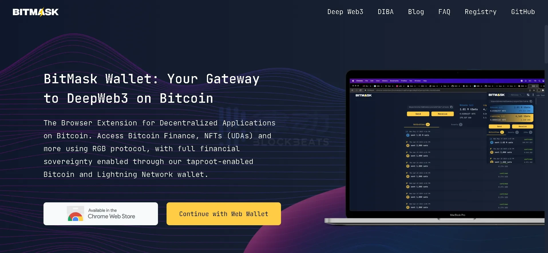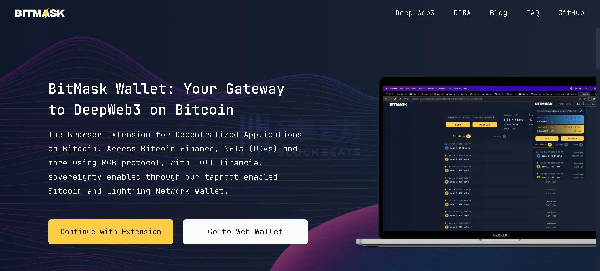 BitMask Wallet 由 DIBA Global 推出,是 RGB 生态的首个 nft 钱包,目前正在比特币测试网上运行。此版本中创建的所有 SAT 和资产都是通过测试比特币完成的,即将推出在比特币主网上的交易。