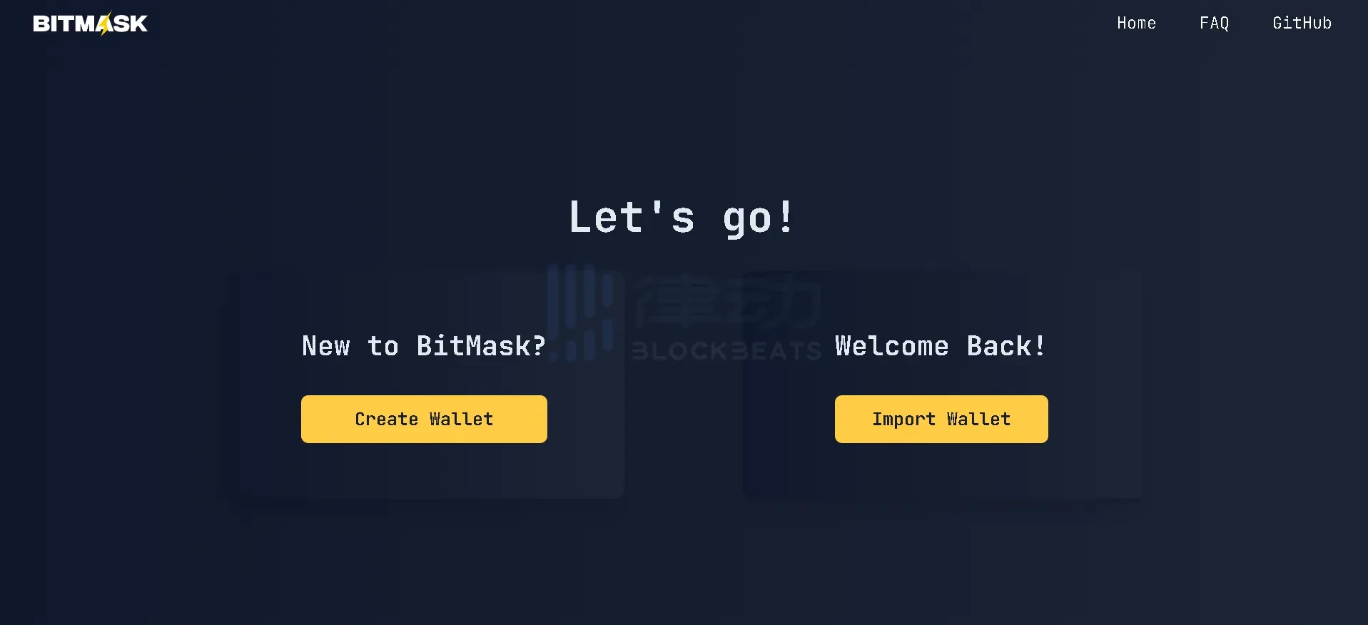 3. 新用户在此界面选择「Create Wallet」(创建钱包)。如果你以前使用过 BitMask,可以通过输入之前设置的密码和助记词来「Impor Wallet」(导入钱包)。