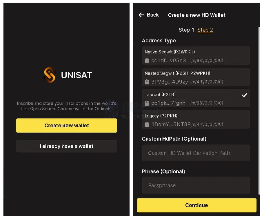 2. 在 chrome 浏览器扩展程序中,打开 Unisat 插件。新用户在此界面选择「Create new wallet」(创建新钱包)。输入密码注册后会弹出 12 位助记词,备份助记词,选择后面为 m/86/0/0/0/0 的地址,点击「Continue」即可创建成功。