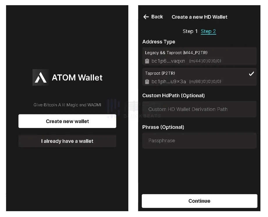 2. 在 chrome 浏览器扩展程序中,打开 ATOM Wallet 插件。新用户在此界面选择「Create new wallet」(创建新钱包)。输入密码注册后会弹出 12 位助记词,备份助记词,选择后面为 m/86/0/0/0/0 的地址,点击「Continue」即可创建成功。