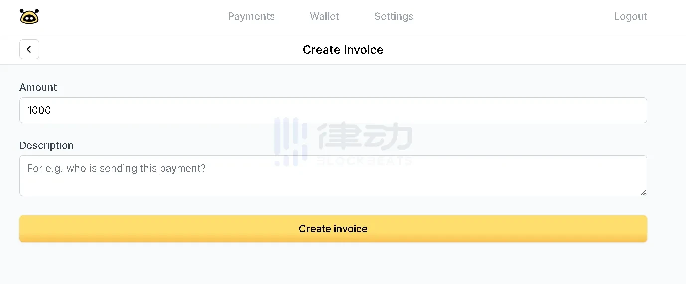2. 在「Amount」中填入需要充值的金额,单位为聪。点击「Create invoice」生成 invoice 编号,去交易平台中将平台上的 BTC 提到 Alby Wallet。提币网络选择「BTC-Lightning」后提交,等待 BTC 到账。