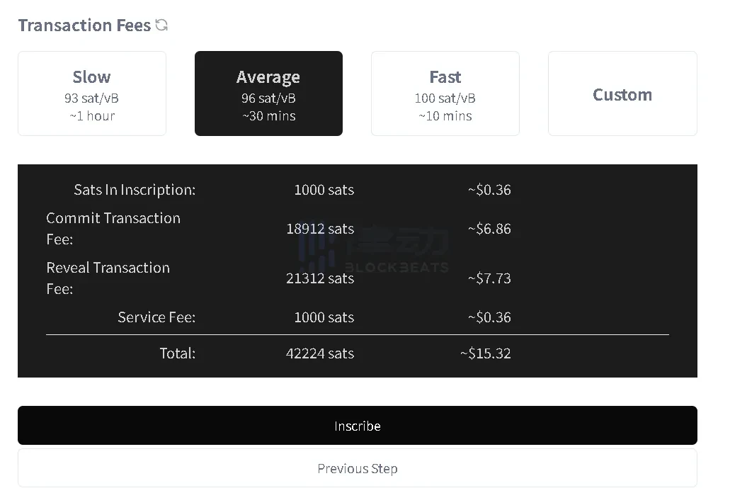 5. 选择你需要的铸造速度,点击「Inscribe」,链接 ATOM Wallet 支付所需金额即可开始铸造。