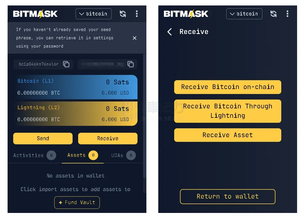1. 打开 BitMask Wallet,点击「Receive」,选择你需要转入的资产网络,生成对应的钱包地址后将其复制到交易平台。