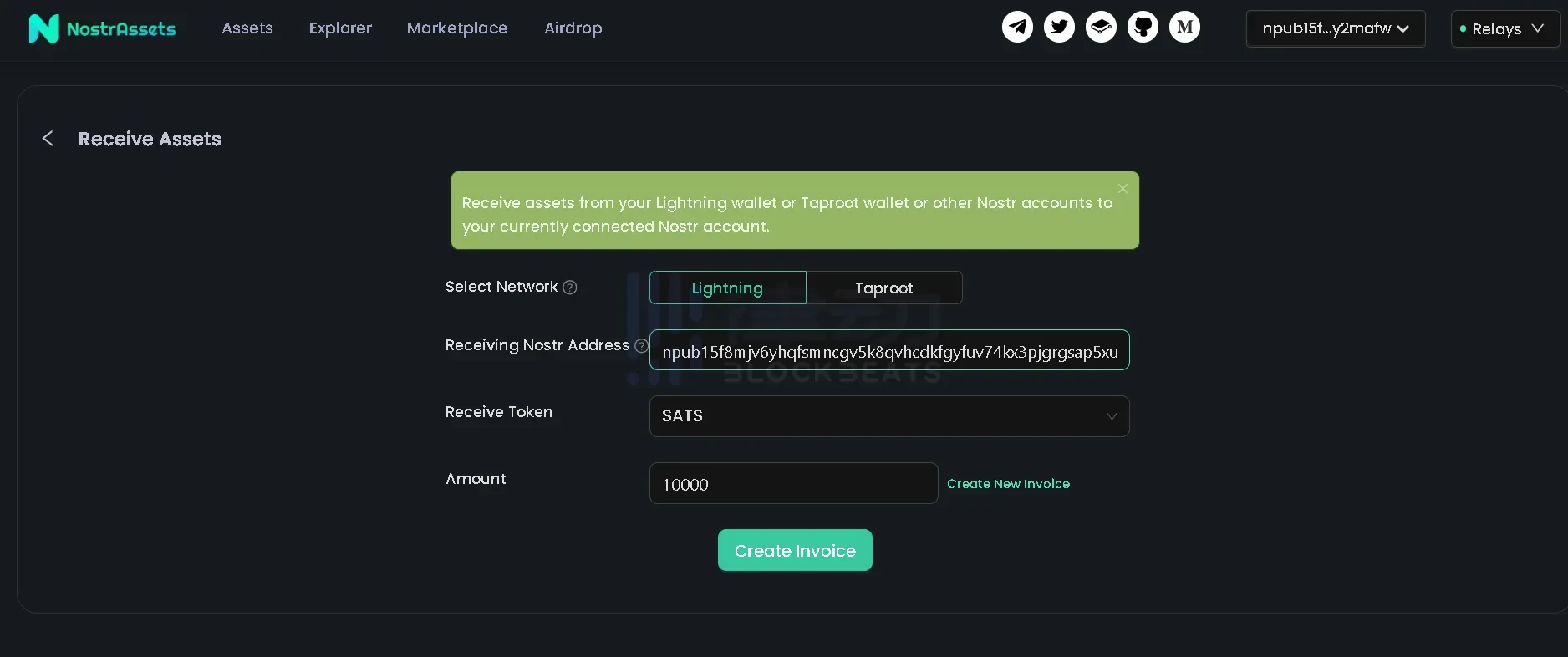 2. 选择「Lightning」(闪电网络),在「Amount」中填入需要转入的资产数额,点击「Create Invoice」,生成 Invoice 后将其复制到 Alby Wallet 的「Send」页面,填入 Invoice 编号,BTC 即可充值到 Nostr Assets 进行交易。