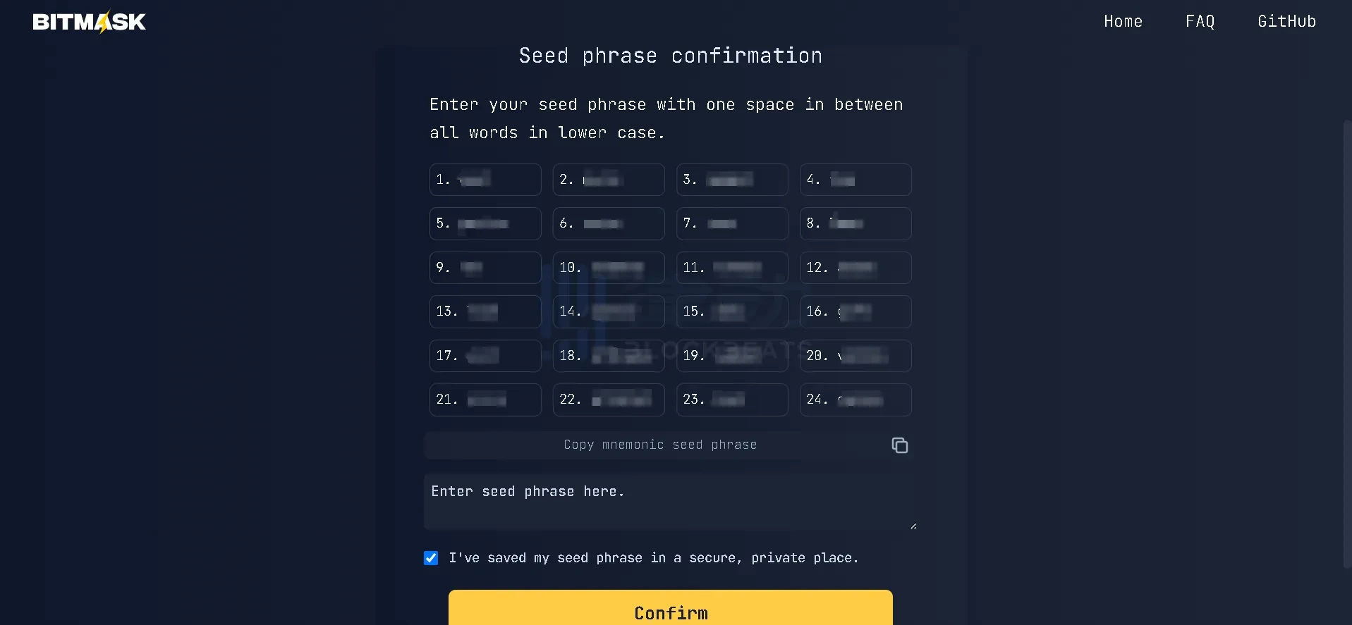 7. 点击「Copy mnemonic seed phrase」保存助记词,复制到「Enter seed phrase here」框中并勾选下方选项,点击「confirm」,跳转到新页面后点击「launch」,BitMask 钱包就创建完成了。
