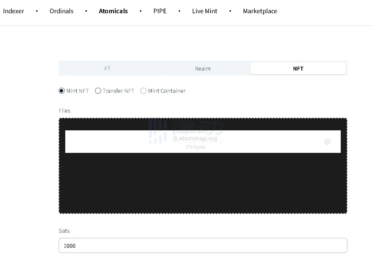 或雕刻网站开始刻字,链接 ATOM Wallet,顶部选择 Atomicals,下方选项卡选择 NFT。以 0.atommap.svg 为例,将 0.atommap.svg 文件上传到黑色方框中.