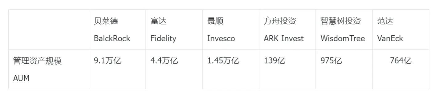 现货 ETF 的这些申请者中,需要重点了解的是贝莱德、富达和景顺这三家,加密市场的所有机构规模之和、甚至加密市场资产规模总和都不及这三家任意一家的管理规模。