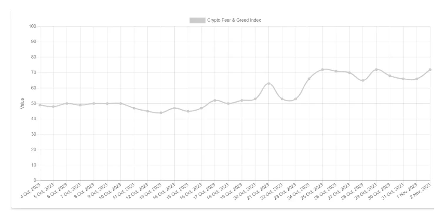 可以看到过去一个月比特币 ETF 相关的传闻一定程度上带动了市场的情况,恐惧与贪婪指数由 50 上下波动来到了 70 上线波动,发生了大量买入,让投资者变得“贪婪”,但还没有到估值过高导致泡沫有破裂风险的程度。