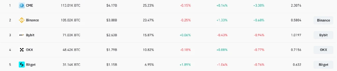 Coinglass 最新数据显示,CME 比特币期货未平仓合约约 41.7 亿美元,排名第一,其次为 Binance (38.8 亿美元)、 Bybit (26.3 亿美元)、OKX(17.9 亿美元),而 Bitget(11.5 亿美元)紧随其后,位列第五名。
