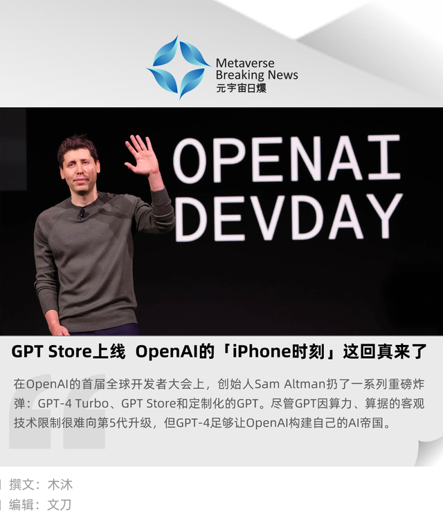 OpenAI首届全球开发者大会上,Sam Altman再次给AI行业扔了一系列重磅炸弹。GPT-4 Turbo、GPT Store和定制化的GPT在大会上发布,OpenAI的生态体系初具雏形。