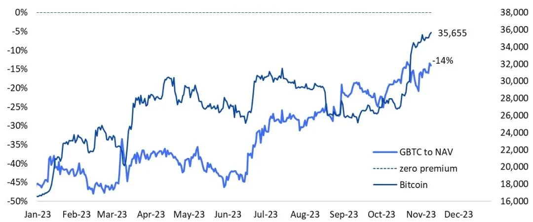 图表 3:灰度 GBTC 相对资产净值的折扣已从-45% 收窄至-14% ,表现优于比特币