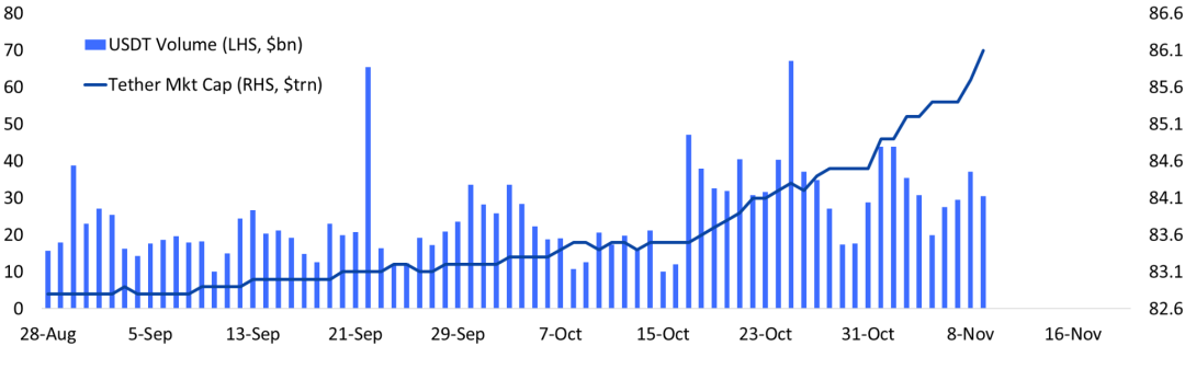 图表 5:TetherUSDT 市值大幅上涨,新铸币意味着新流入, 860 亿美元