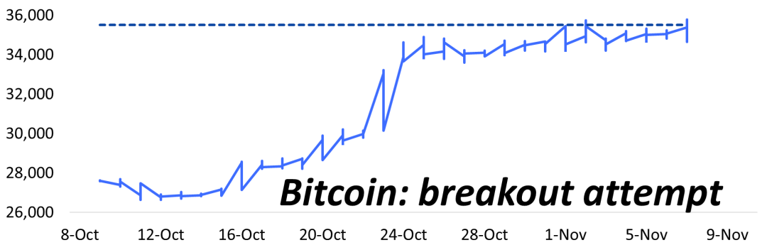 如果通胀再次下降,下周美国的 CPI 数据可能会引发比特币的又一轮上涨。我们预计比特币将试图突破最近 3.4 万至 3.5 万美元的交易区间。突破 36, 000 美元可能会推动比特币走向下一个技术阻力位 40, 000 美元,到 2023 年底可能达到 45, 000 美元。随着美国交易时间内买家的稳步增加,以及比特币突破的持续尝试,我们可以看到价格在本月底(和年底)反弹。圣诞老人行情随时可能开始。
