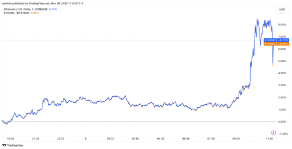今日凌晨,BTC再有异动。凌晨彭博社分析师James在X上发布猜想称由于灰度胜诉,SEC或将开启在11月8日到17日开启以贝莱德为首的机构BTC现货ETF特殊审查窗口。尽管猜想并未得到证实,但受此情绪面影响,BTC再度突破37000美元。