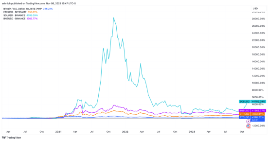以太坊与BTC、SOL和BNB的增长对比,来源:Forbers