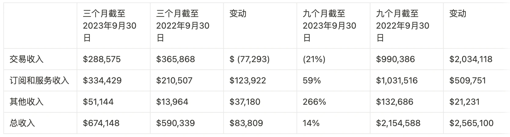 Coinbase 2023 第三季度订阅和服务收入为 3.34 亿美元,它在 2023 年第三季度总收入占比 49.55% 。