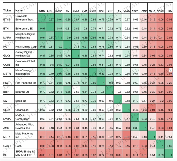 图为 COIN 和 ETH 以及其他相关资产的相关性( MARA , HUT, GLXYCOIN, MSTR 等)均为跟随 ETH 走势较为紧密的标的