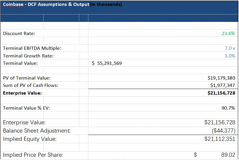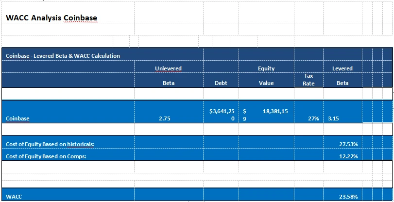 为执行贴现现金流分析,根据 Coinbase 的资本结构使用了当前的 D/V(67% )和 E/V(33% )比率。计算 Coinbase 的带杠杆股本贝塔值为 3.15 。使用 CAPM 模型,假定市场风险溢价为 7% 和无风险利率为 5.5% ,计算出权益成本。使用公司高级票据的贷款成本,并结合 27% 的有效税率来获得税后贷款成本。得到公司的加权平均资本成本(WACC)为 23.58% 。