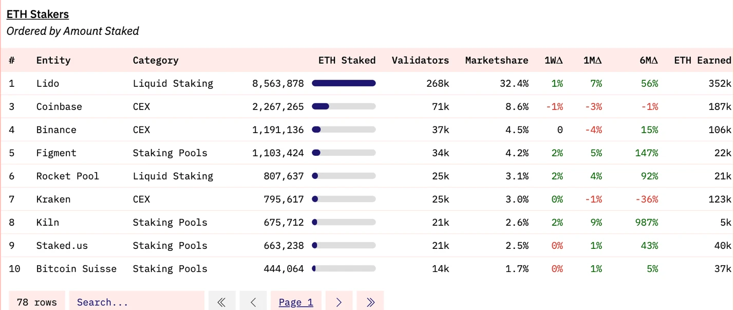 Base 链带给 Coinbase 的收入达到 100 w(如果算到实际 Coinbase 收取的绝对值会更小),而再看 Coinbase 的 ETH staked 数量,在所有 CEX 中排名第一,市占率 8.6% ,总排名次于 Lido ,已实现的 ETH 收入为 187 k 约 300 mln 美元,这其中 Coinbase 收 25% -35% 的佣金,即约 1 亿美金的收入来自于 Staking 业务。
