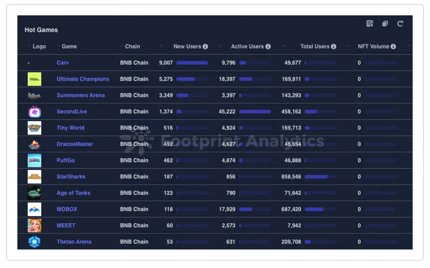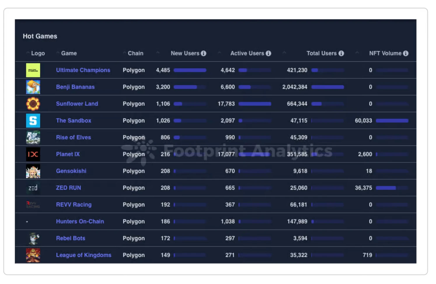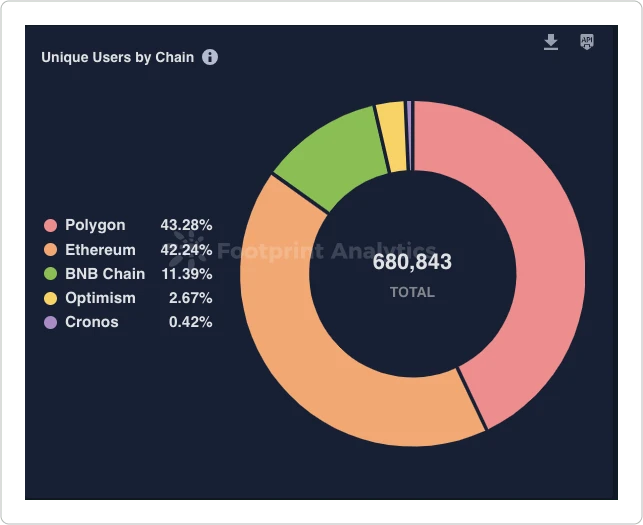 以下三张图表比较了以太坊、BNB 和 Polygon 上的游戏活动。Polygon 在游戏中突出表现,像是 Ultimate Champions 、Benji Bananas 和 Sunflower Land 等游戏拥有惊人的用户数。未来游戏可能会转向其他L1或L2解决方案,并由于用户的高成本和费用,可能完全停止在以太坊上。