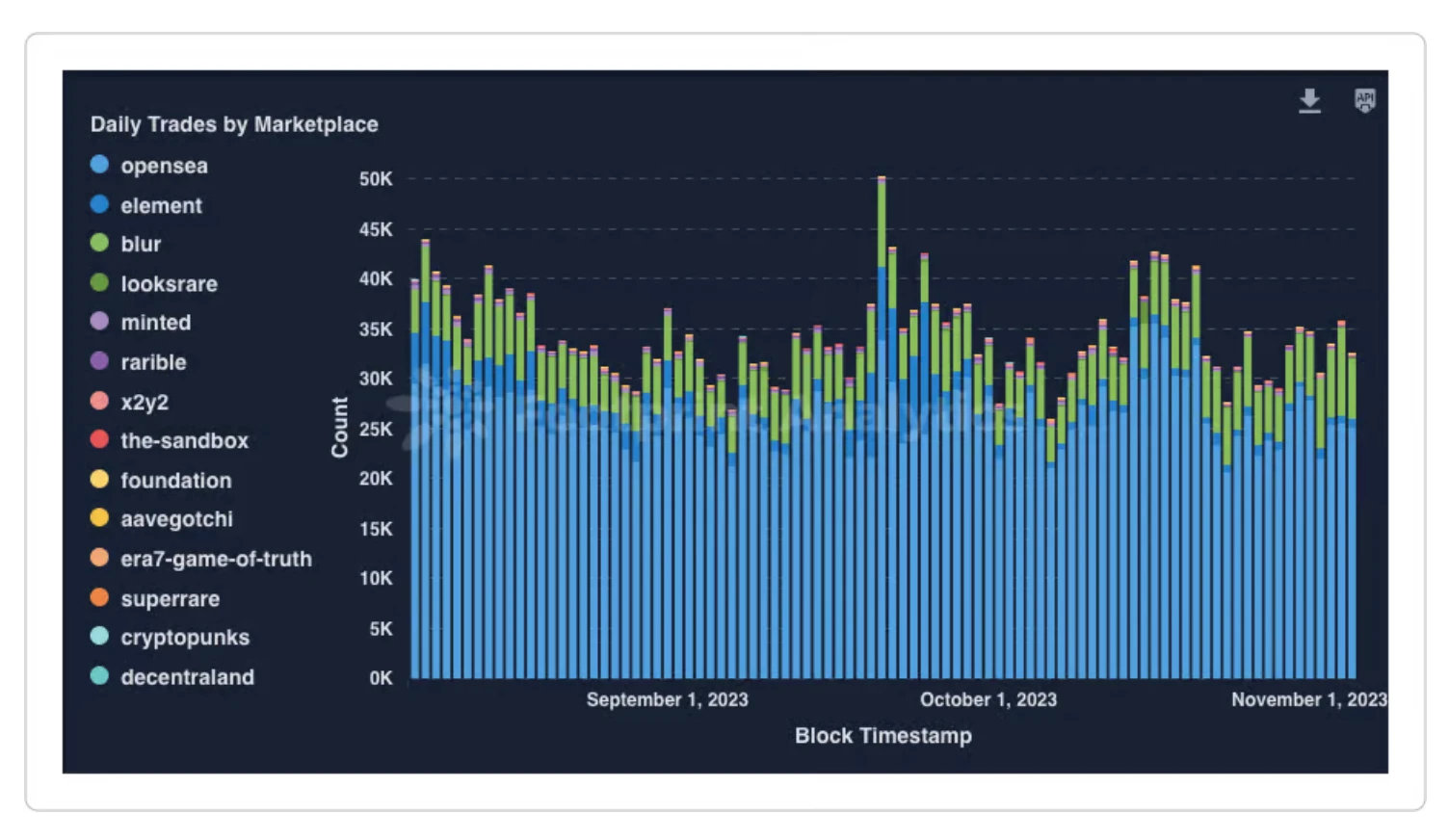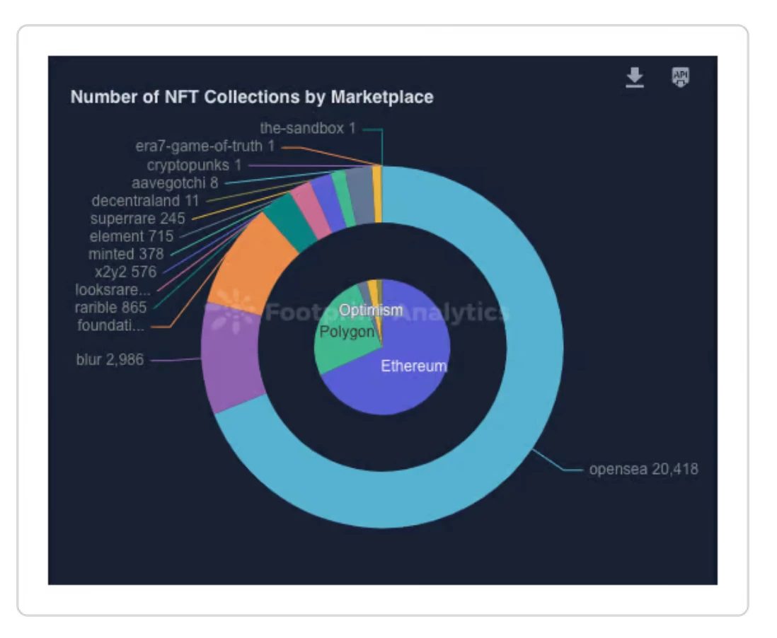 在 NFT 市场中, OpenSea 在收藏数量方面保持其主导地位,使 Blur 远远落后。值得注意的是,Blur 引起了相当大的关注,特别是考虑到它的推出是在牛市高峰之后。与那些在牛市高峰时启动甚至提供空投的老平台不同,它们无法产生相同水平的兴趣。