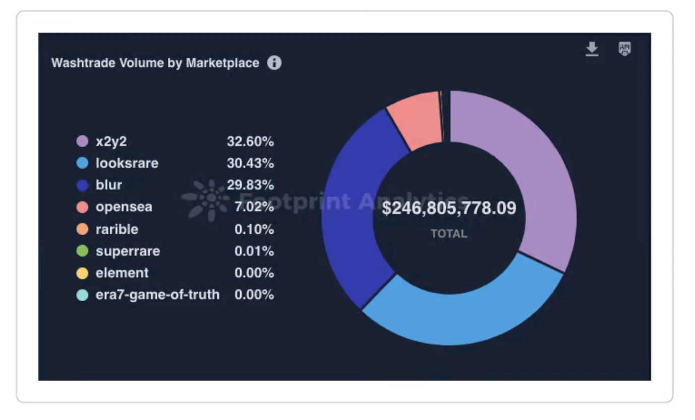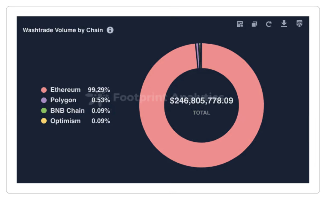 值得注意的是,大多数的洗盘交易发生在以太坊上。这很有趣,因为这表明在 BNB 和 Polygon 等区块链上观察到的增长可能更有机并反映了实际的用户活动。