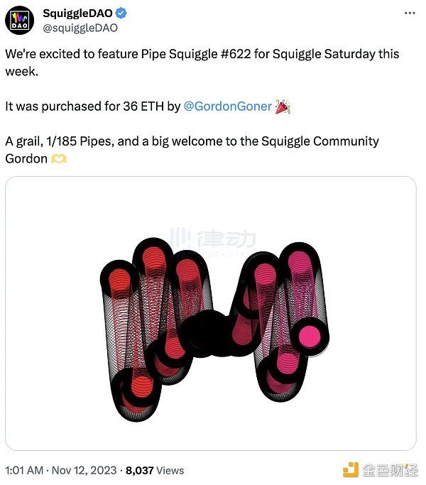 @GordonGoner(Yuga Labs 联创)于 11 月 回归市场,并频繁买入众多 NFT 系列产品,其中包括以 36 ETH 的价格购买了Squiggle 系列 NFT 产品。Squiggle 当前地板价位 0.47 ETH。