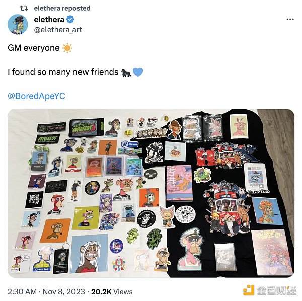 前科技公司创始人、社区 KOL@elethera_art于 11 月 8 日分享了自己购买的 Bored Ape Yacht Club 新产品。据 Blur 数据显示,Bored Ape Yacht Club 系列 NFT 地板价曾于10 月 30 日上涨至 30ETH,7 日涨幅达 6.46%,截止发稿时回落到 29.95 ETH。