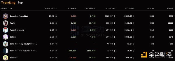 同时,据 BlockBeats 观察,包括 BAYC、Pudgy Penguins、Mocaverse、Gemisis、Back To The Future、DeGods 等在内的 NFT 地板价在近半个月来实现普涨。