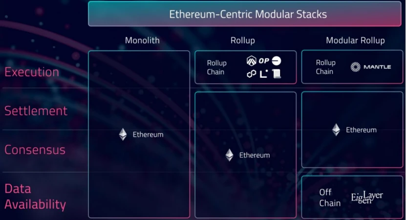 较新的模块化 rollup 将数据可用性层移出以太坊。例如 Mantle ,它仍然依靠以太坊的结算和共识,但是利用 Mantle DA 作为数据可用性层。Mantle DA 进行数据排序并提供数据证明,但无需执行交易;执行交易被有效地外包给 Mantle 的执行层。