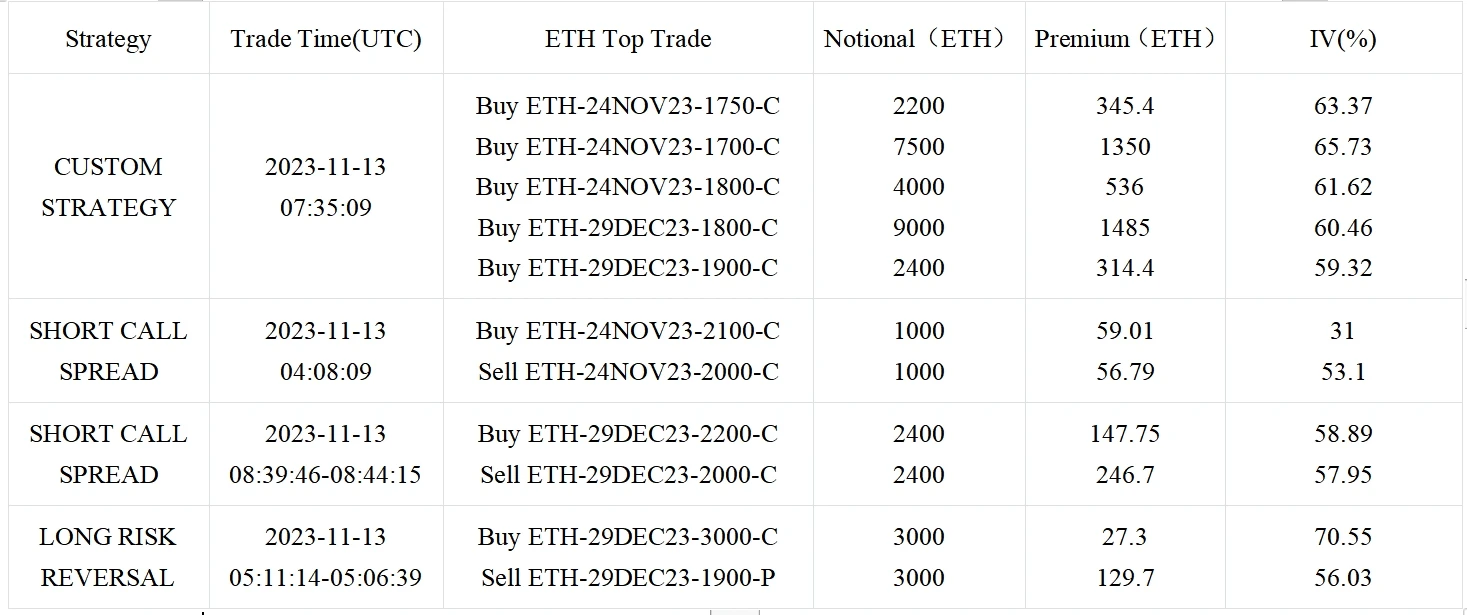 同样是客制策略,我们还观察到交易员在 ETH 上一次性 买入平仓 了数笔 24 Nov 和 29 Dec 1750 ~ 1900 的 ITM Call,数量在 2000 ~ 9000 ETH 不等。