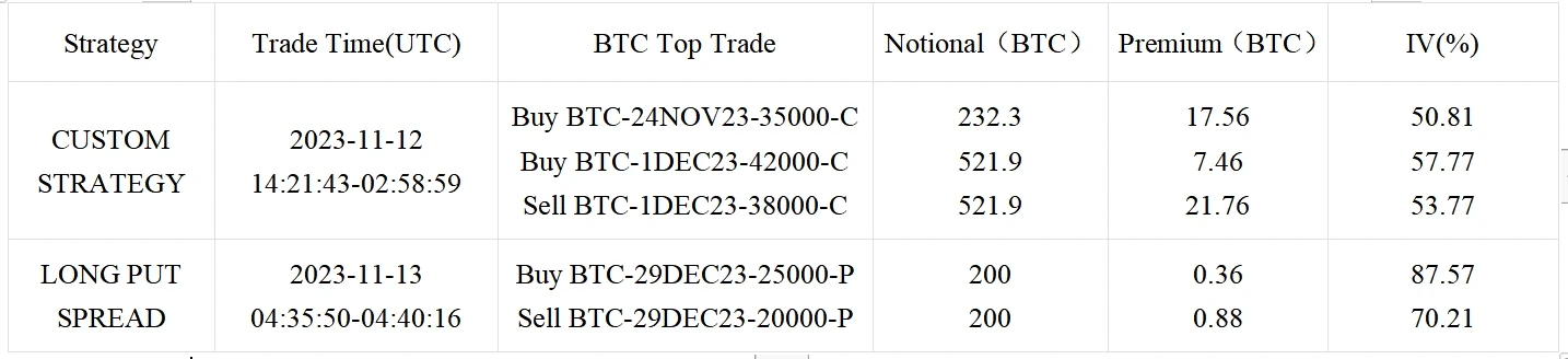 交易方面, Sell Call Spread 成为这段市场冷静期的焦点。在 ETH 上, 24 Nov 和 29 Dec 期限上的 平值 Call (K= 2000) 遭到大量抛售 ,同时用买入 2100/2200 的 Call 作为保护;BTC 方面则是有一组客制化策略,通过卖出 1 Dec 38000 vs 42000 Call Spread 获得 Premium 并以几乎 zero-cost 的方式买回了部分十一月底的 ITM 35000-C,总成交额接近 1300 BTC。