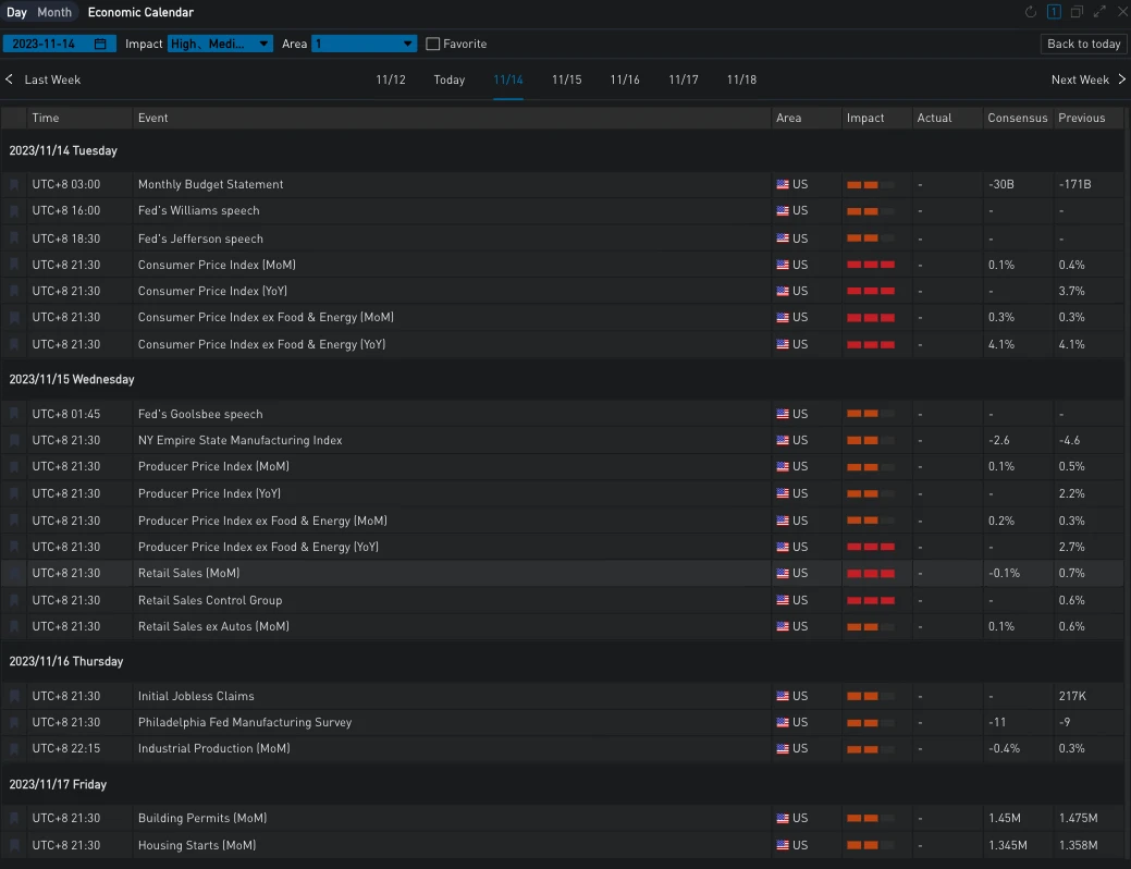上周五( 10 Nov)晚美国公布密歇根消费者情绪指数录得 60.4 ,低于预期的 63.8 。美三大股指高开高走,道指/SP 500/纳指分别上涨 0.9% /1.3% /2% 。10 年期美债收益率小幅走高后回吐涨幅,现报 4.638% ;对政策更敏感的两年期美债收益率持稳在 5% 以上,现报 5.062% 。本周市场将重点关注(UTC+ 8) 14 Nov 21: 30 的美国 CPI 指数以及 15 Nov 21: 30 的 PPI 指数公布。