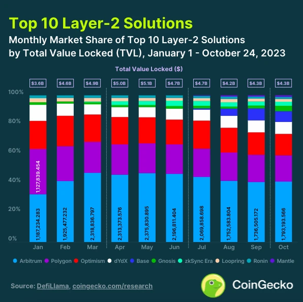近日,CoinGecko 发布了一份 报告 ,分析了多个 Layer 2 在今年的 TVL 和市场份额变化情况。推出仅仅数个月的 Base,已经成为了第五大 Layer 2 网络。