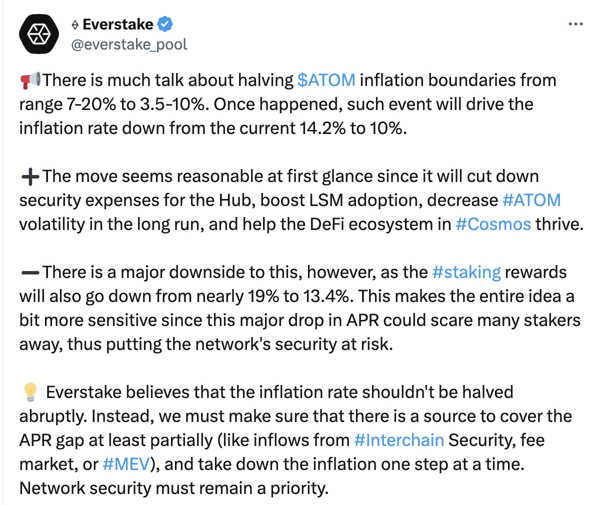 然而,反方认为这一提案存在一个关键缺陷,即将 Staking 奖励从近 19% 降至 13.4% 。这一大幅度的 APR 下降可能会使许多质押者望而却步,从而对网络的安全性构成威胁。因此,他们主张通货膨胀率不应该突然减半,以维持较高的安全性水平。