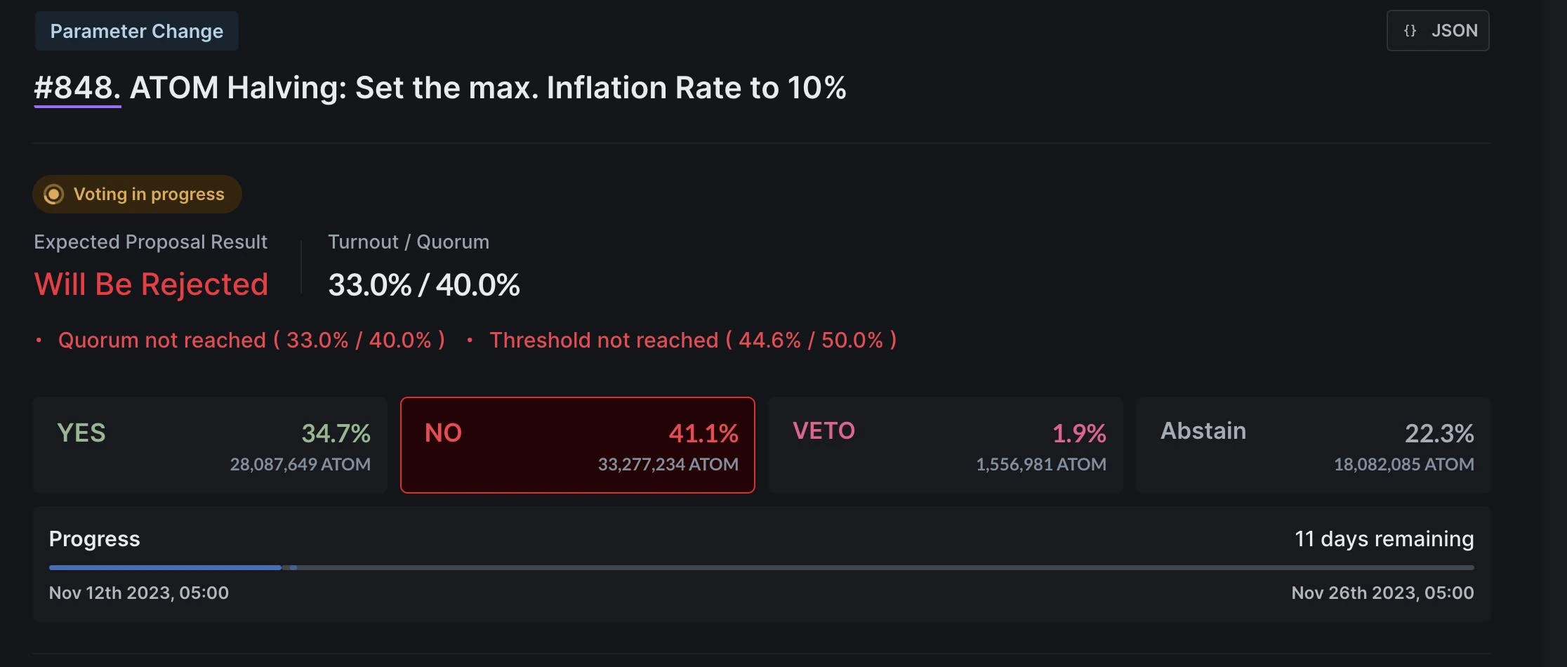 Cosmos 网络上演着一场关乎未来的博弈,当前「NO」选项取得了大多数支持。距离提案结束还有 11 天,面临的选择是继续维持高通胀率,还是通过减少通胀,推动 Atom 价格上涨?