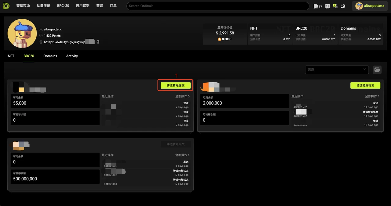 铸造:进度未到 100% 的代币,可以自己进行铸造,俗称打铭文。