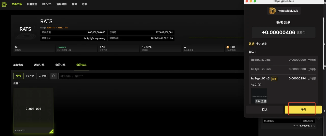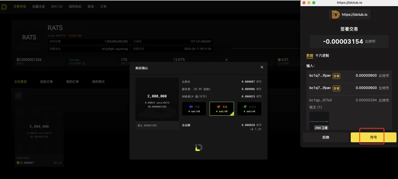 购买时会弹出钱包确认,信息确认无误后点击确认,确认后等待链上确认即可,链上确认后购买的铭文就会显示对应在钱包内。购买完成✅