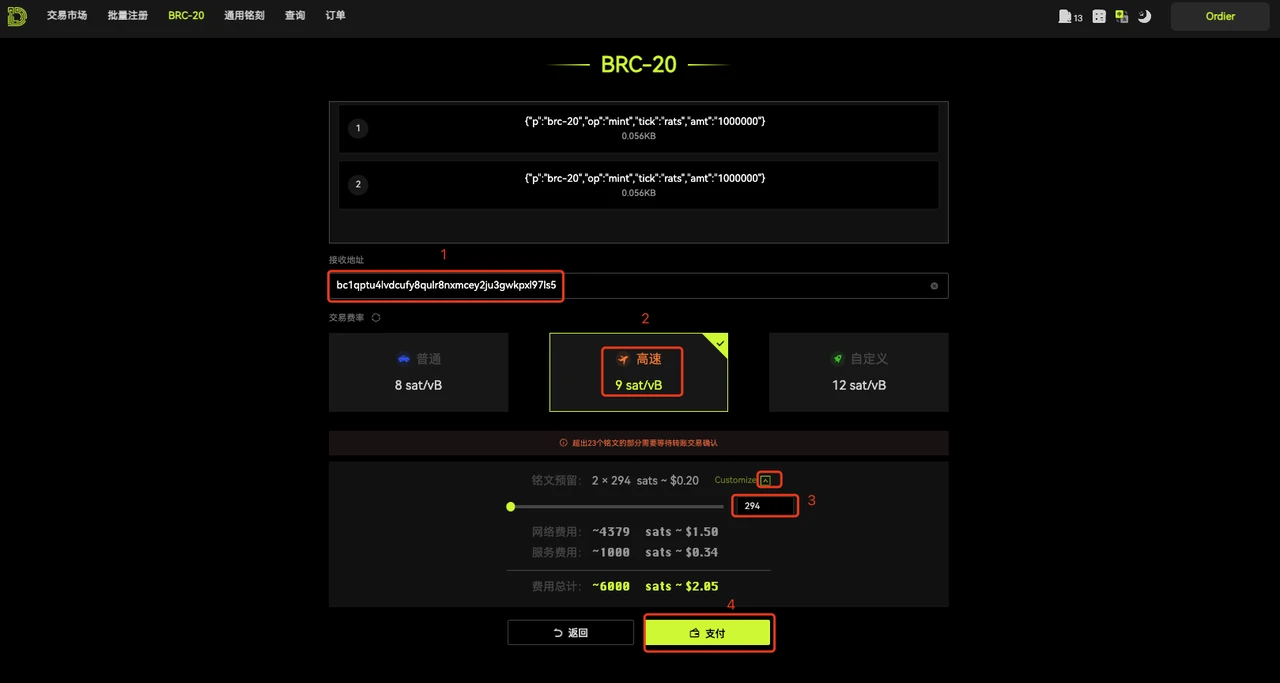 铭文预留:预留聪可以自定义调整。建议使用 bc 1 q 开头的地址,这样预留聪降到最低 294 ,费用最省。