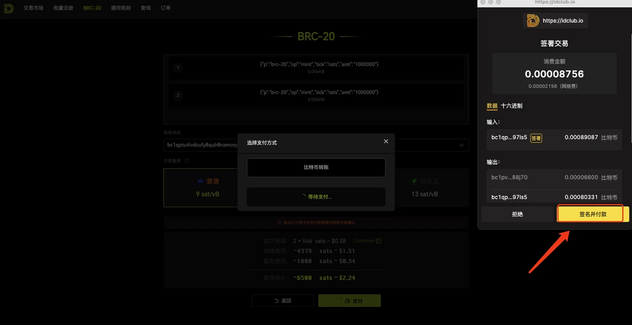 5.弹框信息确认后,点击签名并付款提交铸造转账