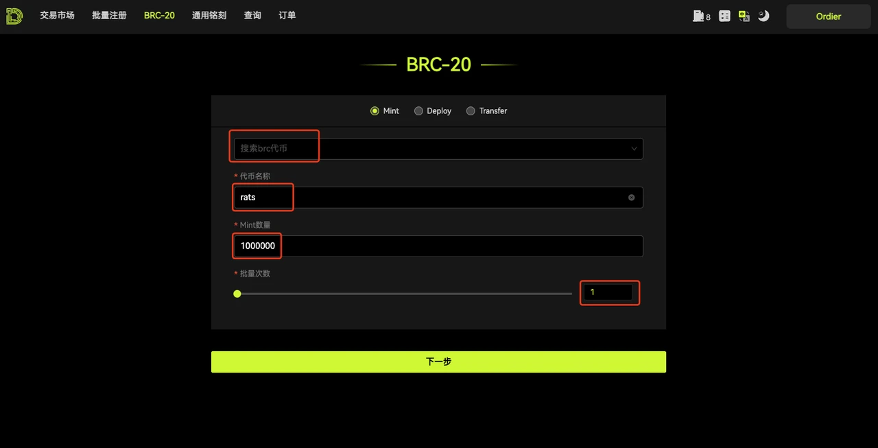 3.跳转到 BRC-20 铸造页面,填写需要铸造代币的名称、单张铭文包含的代币的数量(默认最大)以及张数