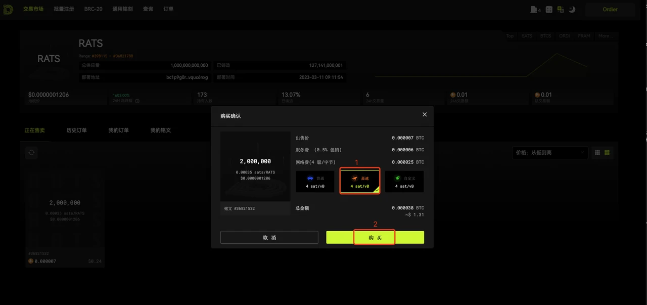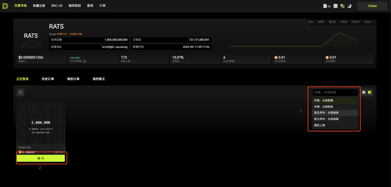 搜索需要购买的铭文,以 RATS 为例,点击铭文进入详情列表,找到价格合适的挂单,点击购买