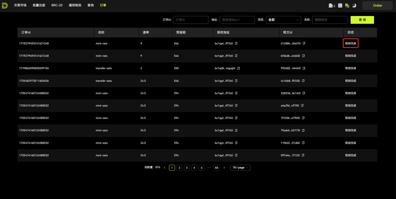 6.支付成功后,自动跳转到订单页面,展示订单的订单 ID、金额、速率(提交订单时的 gas 费)、数量、铭刻的内容(铸造的铭文)、收款地址、订单时间 、支付状态、铭刻进度