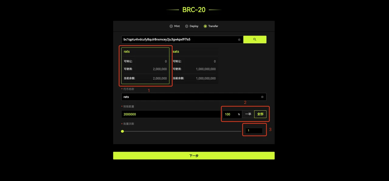 批量次数:就是分成几部分,假如转账数量为 100 ,批次为 2 ,就是有 2 份数量为 50 的铭文。
