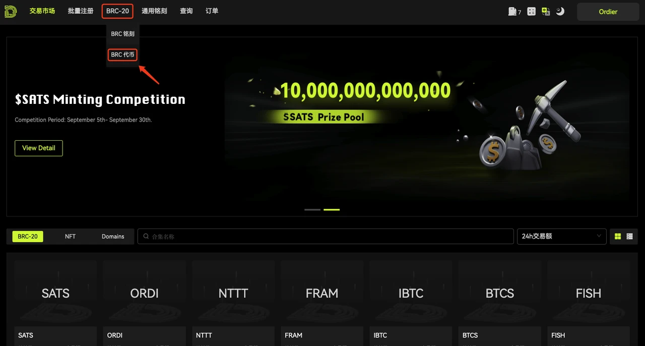 2.页面左上方点击 BRC-20 ,选择 BRC 代币