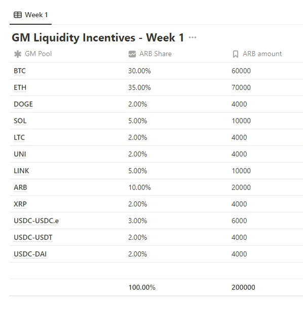 GMX_V2近期增加流动性激励,以上数据是近期第一周提供的流动性激励 ARB 代币的数据,该激励会每周按照不同品种的激励数量根据相应池子的比例定期发放给 LP。